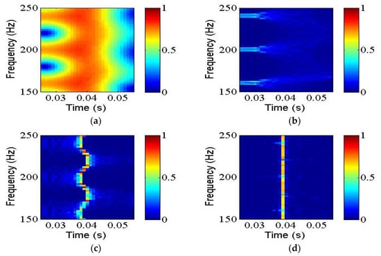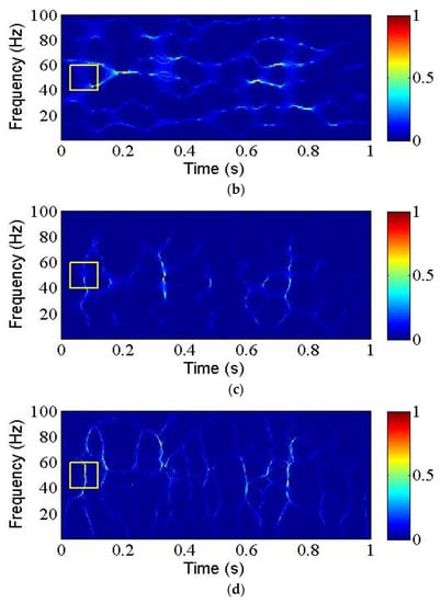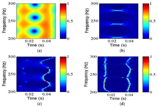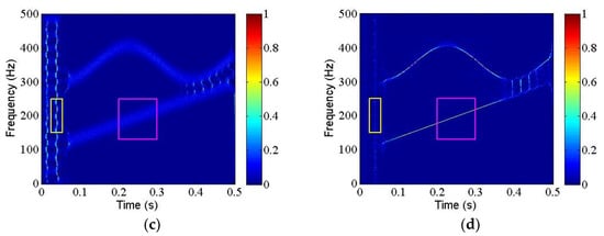 In order to obviously compare the performance of the above-mentioned approaches, we enlarged some areas indicated by two colored rectangle boxes in Figure 2; the results are depicted in Figure 3 and Figure 4, respectively. For two impulse signals, the chirp signal and the sinusoid signal, the STFT exhibits poor time–frequency resolution (Figure 3a and Figure 4a). The FSST provides a relatively nice TFR with a higher-frequency resolution (Figure 4b). However, for the signals with a strongly varying IF, both STFT and FSST fail to give the desired result. Compared with the STFT and FSST methods, FDSST can more effectively characterize the time attribute of the signal (Figure 3c). Furthermore, one can clearly see the advantage of FDSST2 in enhancing the energy concentration along the time direction (Figure 3d), which is more helpful for the feature extraction of strong frequency-modulated signals.