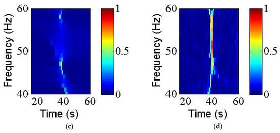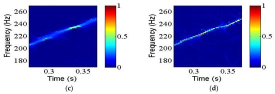 In addition, to illustrate FDSST’s and FDSST2′s robustness with respect to noise, we generated a series of noisy signals with signal-to-noise ratios (SNRs) ranging from 0 to 30 dB. Figure 1b shows the signal with an SNR of 4 dB. The resulting TFRs of applying the STFT, FSST, FDSST, and FDSST2 methods are displayed in Figure 5, and the enlarged TFR results marked by two rectangle boxes are depicted in Figure 6 and Figure 7. As can be seen, the STFT is prone to being affected by noise, which blurs the TFR. In the result of FSST, the noise enables time–frequency energy to spread around the ridge (Figure 7b), and as a result, the IF cannot be accurately estimated. By contrast, FDSST and FDSST2 have better anti-noise ability, especially the FDSST2. It can still show good energy concentration in the presence of noise (Figure 6d and Figure 7d) where the local characteristics of the signal can be described well.