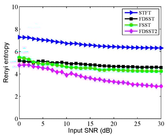 The Renyi entropy is a common measure to estimate the distribution concentration of a TFR. The larger the Renyi entropy is, the less concentrated the TFR is [27]. Considering the readability of the TFR, we utilize the Renyi entropy to evaluate the energy concentration of the TFRs obtained by the STFT, FSST, FDSST and FDSST2 methods. In the paper, the 3-order Renyi entropy is used to quantitatively measure the time–frequency energy concentration since it uses the smallest integer value to yield a well-defined useful information measure for a large class of signals [30].