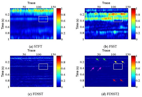 To further illustrate the potential of frequency-domain SST in field data analysis, we employed real seismic data from a seismic land survey (Figure 9a), which was analyzed previously by Chen and Fomel [4] and Liu et al. [29]. These data are composed of 150 traces with 500 samples per trace and a sampling interval of 2 ms. First, a seismic trace labeled 120 (Figure 9b) was taken as an example to show the TFR results from the STFT, FSST, FDSST, and FDSST2 methods, which are depicted in Figure 10, and the enlarged local area indicated by a yellow rectangle box is shown in Figure 11. The STFT result indicates that there are four obvious spectral energies at 0.08 s, 0.15 s, 0.32 s, and 0.75 s, which correspond to the four strong amplitudes in the waveform (Figure 9b). However, the STFT is unable to effectively identify the time of occurrence due to the low time–frequency resolution (Figure 10a). The other methods, FSST, FDSST, and FDSST2, exhibit sparser representations in the time–frequency plane. It should be noted that the spectral energy of FSST diffuses along the time direction since the time–frequency coefficients are squeezed in frequency, which makes the time localization of FSST poor (Figure 10b and Figure 11b). In the results of FDSST and FDSST2, the time–frequency energy is concentrated in time (Figure 10c,d). In this sense, FDSST and FDSST2 are more helpful for detecting these existing spectral energies and thus facilitating seismic interpretation. In particular, FDSST2 more clearly characterizes the time of these spectral energies (Figure 10d and Figure 11d), which is due to the second-order local modulation operator.