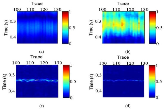 Next, we extracted 40 Hz frequency slices based on the results of the STFT, FSST FDSST and FDSST2 methods, which are displayed in Figure 12. Figure 13 is the enlarged local area from a white rectangle box in Figure 12. The STFT fails to effectively provide stratigraphic information due to the impact of the time–frequency resolution (Figure 12a and Figure 13a). FSST improves the frequency resolution to a certain extent, but it is not an ideal result (Figure 12b and Figure 13b). FDSST and FDSST2 provide much sparser representations and depict the spectral characteristics of seismic reflections more clearly (Figure 12c,d). Compared to the results of FDSST, FDSST2 performs better, with more continuous reflections and more detailed stratifications (Figure 12d and Figure 13d).
