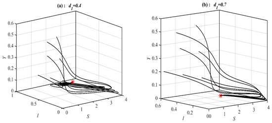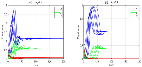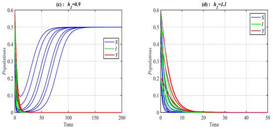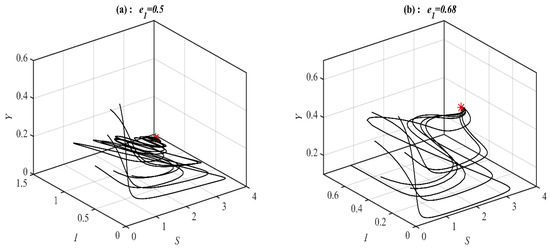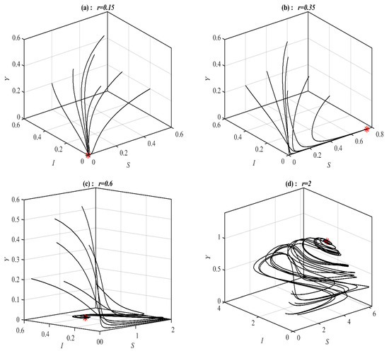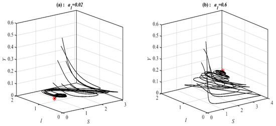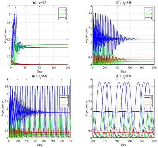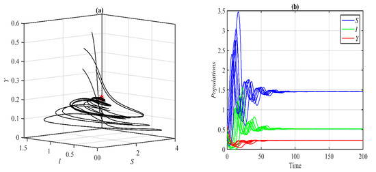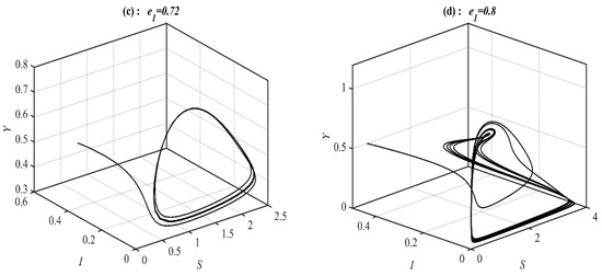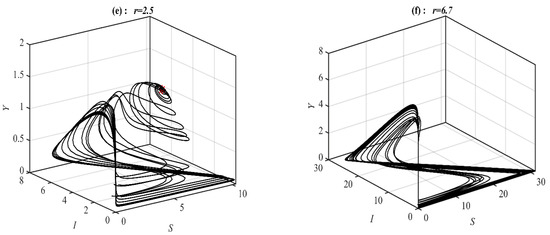 It is obvious from Figure 1 that system (1) has a unique asymptotically stable P.E.P. Now, the influence of varying the value of on the dynamic of the system (1) is studied, and the obtained results are presented at selected values in Figure 2. It is obtained that, for belongs to , , , , , and , the system’s (1) solution approaches , , , , bistable between and 3D periodic attractor, and 3d periodic attractor, respectively.