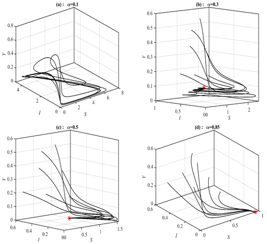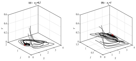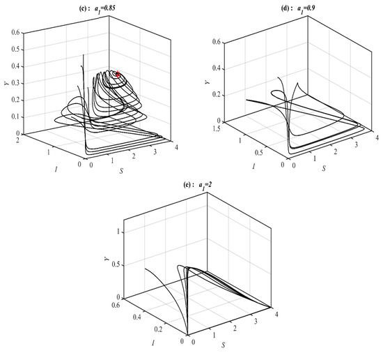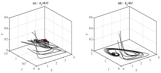 According to Figure 4, Figure 5 and Figure 6, the parameters , and control the stability of the system (1). It is observed that the system converges to , , , and when the parameter belongs to , , , and , respectively; see Figure 7 for selected values of . However, the system converges, , , , a 3D periodic attractor, and a 2D periodic attractor in the -plane when the parameter belongs to , , , , and , respectively, as shown in Figure 8 at the selected values. On the other hand, for in the ranges and it is noted that system (1) converges and respectively as presented in Figure 9 at typical values of . However, for in the ranges and , it is noted that system (1) converges and respectively, as shown in Figure 10 at the typical value of . Finally, it is obtained that varying the parameters and have a similar influence on the dynamics of the system (1).