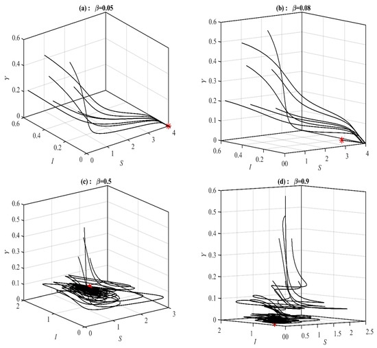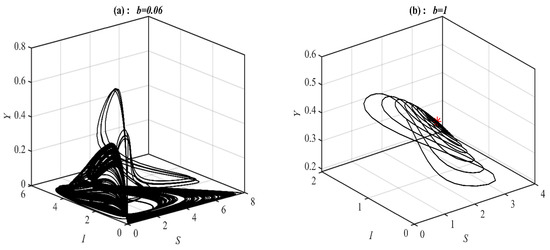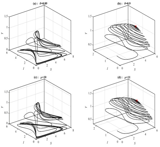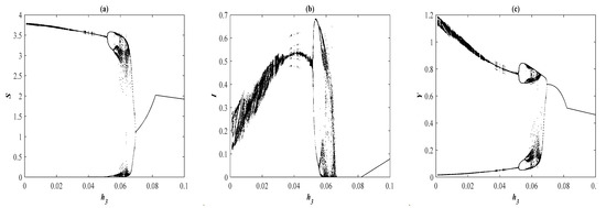 According to Figure 3, there are three bifurcation points in the range of . Similar behaviors are obtained when varying the parameter as those obtained with .