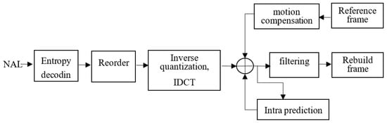 The H.264 video decoding process is shown in Figure 2. The decoder obtains data information from the code stream, obtains transform coefficients through entropy decoding and reordering, and obtains residual blocks through inverse quantization and inverse DCT transformation. At the same time, the decoder uses the header information obtained from the code stream to make the intra prediction and generate prediction blocks. The decoder adds the prediction block and the residual block to obtain the frame image, which is filtered and reconstructed to obtain the decoded image.