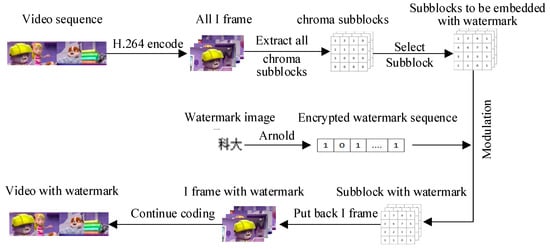 The watermark is embedded in the encoding process of H.264. The embedding position can be selected from I frame or P frame, chroma block or brightness block. I frame will participate in the encoding process of P frame as a reference frame, and the experiment found that embedding watermarking on the chroma subblock can be more resistant to recompression than the brightness subblock, so embedding watermark on the QDCT coefficient of I frame chroma subblock has less impact on the video.