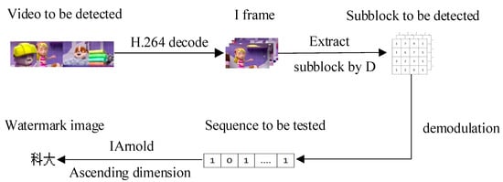 The framework of the video watermark extraction algorithm is shown in Figure 4. Firstly, the video to be detected extracts all I frames in the decoding process, extracts the chroma subblock according to the recorded position in D, demodulates the chroma subblock according to the recorded modulation mode, extracts the watermark sequence, and obtains the watermark image after boosting and inverting the disorder. The pseudo code of watermark extraction is shown in Algorithm 2. The extraction methods corresponding to the four modulation methods are as follows: