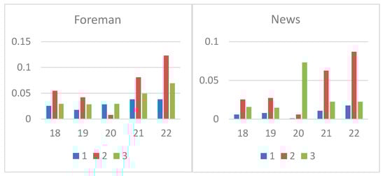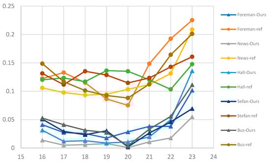 In Table 2, PSNR1 is the PSNR value of the encoded video image and the original video image, and PSNR2 is the PSNR value of the video image and the original video image after embedding the watermark and encoding. It can be seen that the PSNR value of the video after embedding the watermark decreases very little compared with that before embedding, which is no more than 0.2 dB, and the SSIM values are all above 0.99, which indicates that the algorithm in this paper has good invisibility. Moreover, Stefan’s experimental results show that although the video has only 90 frames, the SSIM is still above 0.99 when embedding the same size watermark as in other videos, which indicates that the algorithm from this paper has good invisibility for videos with fewer frames.
