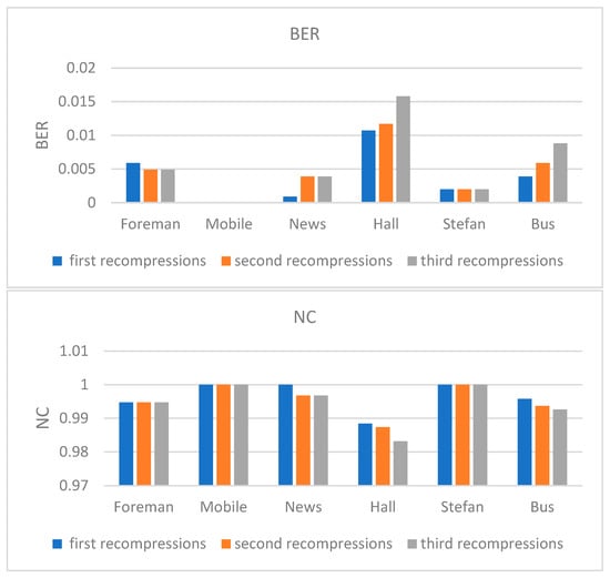Figure 6 shows the NC and BER values of the watermark extracted from the experimental video after the first, second and third recompressions, respectively. It can be seen that the NC values of the watermarks extracted from the experimental videos after three recompressions are above 0.98 and the BER are below 0.016, which indicates that the algorithm has a strong resistance to recompression.