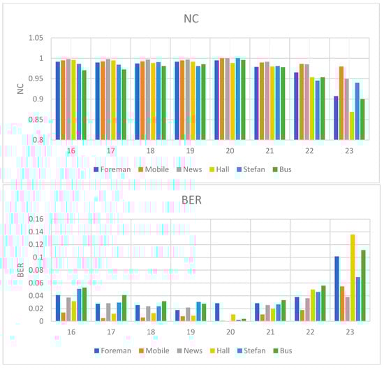 In this paper, experiments are performed on videos under different QP (quantization parameter) for the heavy compression attack. In the experiment, the initial QP is 20, and then a requantization attack with QP from 16 to 23 is performed to calculate the NC and BER values for the extracted watermarked images. The results are shown in Figure 7, the abscissa is the QP value, and the error rates of the extracted watermarks after requantization are all below 0.14, indicating that this algorithm can resist the requantization attack well, especially when the QP is reduced.