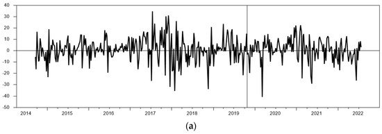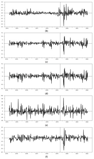 Figure 2a–h show the changes in the returns of all financial assets, with the vertical solid line indicating the point of the COVID-19 outbreak. We can observe that, except for BTC (a) and VIX (e), all financial assets experienced larger fluctuations during the pandemic period, especially in the first half of 2020 before the outbreak, reflecting the extreme instability of the financial market due to external uncontrollable factors. In comparison, the impact of the pandemic on Bitcoin seems relatively low, as the fluctuations before the outbreak were not inferior to those during the pandemic. However, we cannot ignore the risks associated with Bitcoin, as it has maintained a highly volatile state since 2017, with the highest volatility among all financial assets. While investors may rejoice in Bitcoin’s high return, they should not overlook the frequent and rapid price drops that often occur.