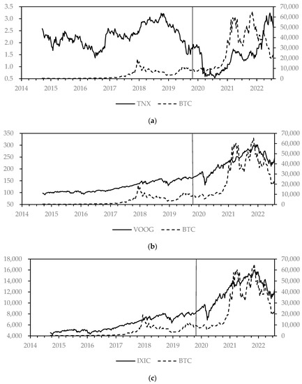 From an observation of Figure 3a, the TNX price trend underwent a reversal in 2018 and experienced a significant decline from the onset of the COVID-19 pandemic until 2020. It rebounded in 2022 to a peak comparable to that of 2018. Interestingly, TNX displayed a slightly negative correlation with BTC before the pandemic, which altered from a positive to a negative correlation during the pandemic. Figure 3b,c portray trends in the US stock market, which demonstrated a more distinct positive correlation with BTC during the pandemic.