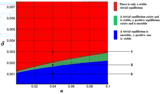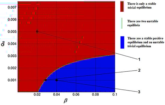 The area of instability of trivial equilibrium and asymptotical stability positive equilibrium has a blue color. The “green” area of parameter variation corresponds to the existence of both equilibria. The trivial equilibrium is stable, and the positive equilibrium is unstable. A stable trivial equilibrium exists in the “red” set.