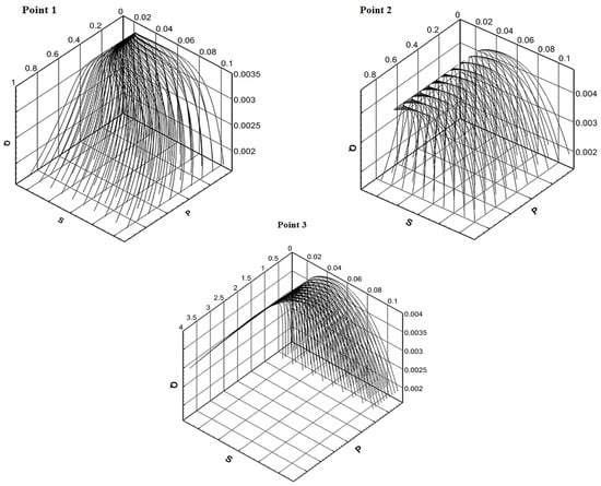Two possible equilibria belong to set A (6). One trivial equilibrium and no more than one positive equilibrium exist for positive constant parameters in Model C. The stability of these solutions can be studied in the range of changes in key parameters using a linearized system by the Lyapunov method [38,39]. The illustration of these dynamical properties is shown in Figure 1 in projection on plane .
