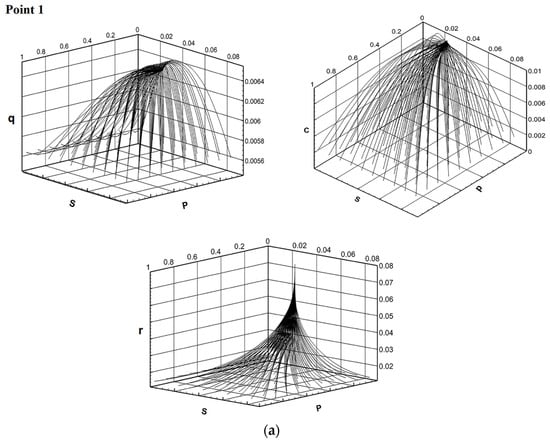(a) Phase portraits in the space of components p,s,q/c/r for the region of stability of trivial equilibrium (point 1 in Figure 3). (b) Phase portraits in the space of components p,s,q/c/r for the region of instability of both equilibria (point 2 in Figure 3). (c) Phase portraits in the space of components p,s,q/c/r for the region of stability of positive equilibrium (point 3 in Figure 3).