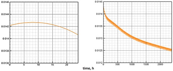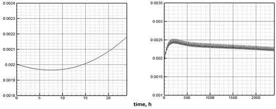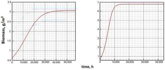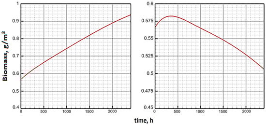 Figure 5 shows the dynamics of biomass along the attractor under constant external conditions calculated using Model C (left) and Model E (right). According to Model C, the quasi-stationary state of biomass is reached nearly four times longer. The dynamics of other indicators on the attractor are shown in Figure 6.