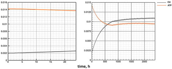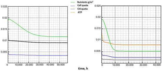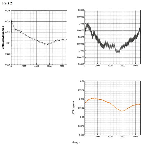 The behavior of the chlorophyll quota and the proportion of ATP in the biomass, which is calculated according to Model E, agrees with the results of laboratory experiments presented in [20]. In the absence of light, phytoplankton cells use ATP as an energy source. Chlorophyll begins to be consumed only when a sufficient amount of energy accumulates. The reaction of organic matter synthesis is slower. Therefore, chlorophyll is also consumed slowly. Consequently, its highest concentration in phytoplankton cells is recorded in absolute darkness [61] (Figure 7, left). On the contrary, the ATP concentration drops to a minimum (Figure 8, left), considering that the consumption of energy-intensive substances increases in the dark due to the absence of other energy sources [62].