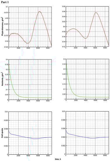 Figure 6 shows that Model E makes it possible to reach the equilibrium state of the system in a shorter period. Obviously, the reason is in the structure of the equations of Model E. The chlorophyll quota directly affects the growth of biomass. The configuration Model E allows cellular structures to quickly “adjust” to the biomass changes that occurred in the previous time step. Sequential (one after another) changes in the main components of the system allow approaching equilibrium faster.
