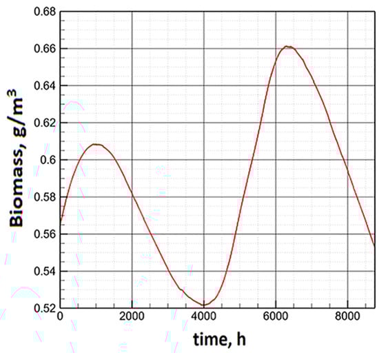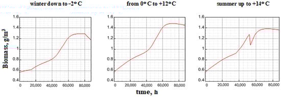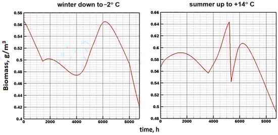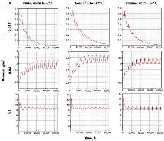 The higher sensitivity of Model E is related to parameter β. Even with a slight increase in its value (above 10−3), the specific biomass increases markedly (Figure 14). At the same time, the temperature still insignificantly affects the annual dynamics.