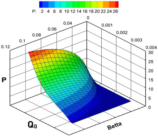 The results of model calculations are as follows: if the value of β is small, and the replenishment of the nutrient resource is limited, then a gradual extinction of the phytoplankton biomass occurs. Numerical experiments have shown that the negative gradient of the growth function is higher when the value of β is smaller. With a slight increase in the proportion of ATP that stimulates the synthesis reaction, the downtrend gradually breaks and turns into an exponential one. With a larger increase in β, the dynamics become stable, including a short-term surge, and then a transition takes place to a quasi-stationary regime. In this case, the step in β affects the maximum biomass value at the burst stage and the average quasi-stationary value but does not affect the dynamic contour itself (Figure 15). Among the endogenous parameters of the model, the value of the minimum cell quota Q0 has a comparable impact. The influence of this parameter does not need to be considered separately given that it has a clear biological meaning. The growth is slower when the minimum cellular quota of nutrients required to start it is larger, and vice versa. The cumulative effect of parameters β and Q0 on the equilibrium values of the specific biomass is shown in Figure 16.