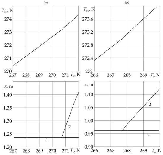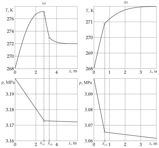 In Figure 2, for time t = 10 day, the reservoir temperature and pressure distributions are presented. The injection pressure of liquid sulfur dioxide corresponds to the value pe = 3.2 MPa (fragment Figure 2a) and pe = 3.1 MPa (fragment Figure 2b). The values of other parameters used in the model are presented in Table 1. As follows from Figure 2, when SO2 is injected at a pressure of pe = 3.2 MPa, the temperature of the system rises above the melting temperature of ice. This means that in addition to the formation of sulfur dioxide hydrate and displacement of methane, the process of ice melting and, as a result, the formation of an area containing methane and water take place in the reservoir. In this case, the region 0 ≤ x < x(n) contains liquid SO2 and its hydrate in pores; the region x(n) < x <x(d) is methane and water, and the region x > x(d) contains methane and ice. At lower injection pressures (pe = 3.1 MPa), as follows from fragment b, the temperature of the system is below the melting point of ice; in this case, the formation of a region containing methane and water does not occur. Thus, at high liquid sulfur dioxide injection pressures, the formation of SO2 hydrate occurs with the formation of three different areas from water and liquid sulfur dioxide, according to the problem statement. In the case of low injection pressures, the formation of SO2 hydrate occurs from SO2 and ice without the formation of a region saturated with methane and water.