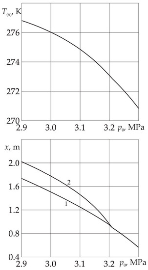 In Figure 3, for the moment of time t = 10 days, the dependences of the temperature T(n) on the near surface of the phase transition, as well as the coordinates of the near and far boundaries of the phase transition, on the injection pressure pe are presented. As follows from the figure, with a decrease in the injection pressure, both the temperature at the near boundary of the phase transition and the length of the region containing methane and water decrease. This is due to the fact that with a decrease in the value of pe, the intensity of SO2 hydrate formation decreases, which is proportional, according to Darcy’s law, to the pressure drop in the system. As a result, there is also a decrease in the magnitude of the thermal effect caused by the reaction of hydrate formation. Thus, in the case of low values of pe (less than 3.2 MPa), the intensity of hydrate formation is low, and the temperature does not rise above the melting temperature of ice. In this case, the formation of sulfur dioxide occurs from ice and SO2 without the formation of a region saturated with methane and water.
