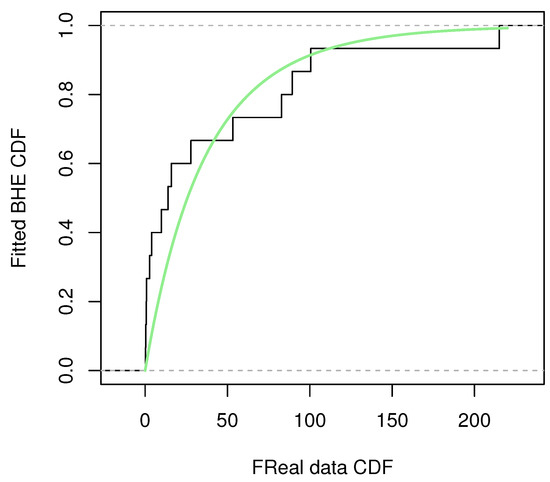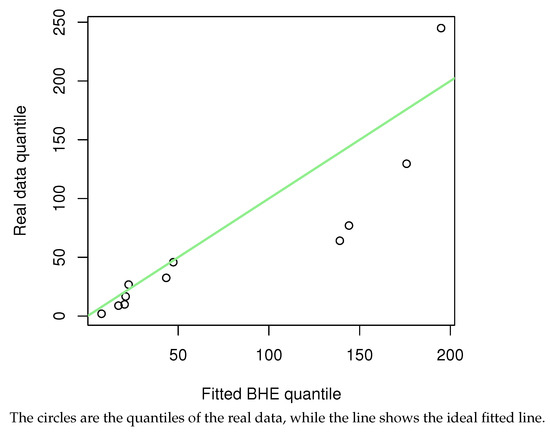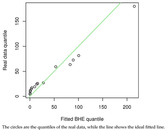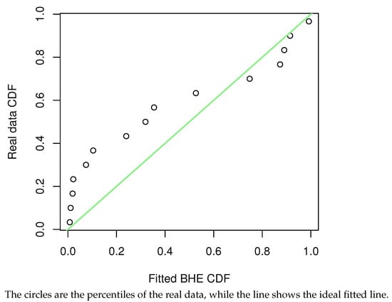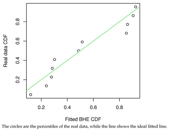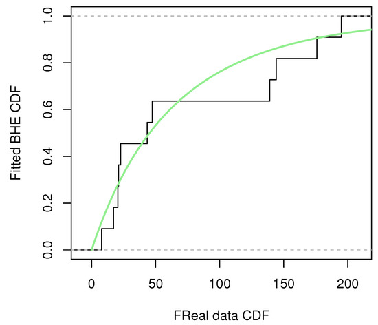 Before the estimation of parameters, the goodness-of-fit of the dataset to the BHE distribution was verified. Firstly, the Kolmogorov–Smirnov test (KS test) was used to measure the distance of the data from the distribution. The KS distance and p-value of data under the constant stress condition were calculated to be 0.2167 and 0.6062, respectively, and the KS distance and p-value of data under the accelerated stress condition were 0.2959 and 0.1167, respectively; at the significance level , the dataset is considered suitable for fitting with the BHE distribution. To visualize how precisely this dataset fits the BHE distribution, a plot of the dataset‘s cumulative distribution with the CDF of BHE is shown in Figure 8 and Figure 9. The green line shows the CDF of BHE distribution. Quantile–quantile plots (QQ plots) (Figure 10 and Figure 11) were further plotted, and the results were obtained as follows. The percentage–percentage plot (PP plot) (Figure 12 and Figure 13) are also presented. The conclusion is the same as the result of the KS test, that is, the model can be fitted using the BHE distribution for this dataset.