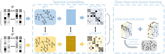 To address these limitations, the proposed approach is as follows: (1) A tensor nuclear norm with a nonconvex approximation function [15,16,17] is utilized to constrain the low-rank tensor. This approach assigns weights to each singular value using a parameter while constraining the contribution of each singular value to the nuclear norm to be close to 1. (2) Inspired by [18,19,20], a novel norm named the Cauchy norm with an upper bound is proposed to handle the noise in the tensor. Compared with the widely used norm, the Cauchy norm is more stable, due to its asymptotic upper bound, which alleviates the influence of noise, especially in the case of high-noise values. By using the Cauchy norm, we prevent large noise values dominating the objective function. By combining these two strategies, we introduce a novel multi-view clustering method called Robust Low-rank Graph Multi-view Clustering (RLGMC) via Cauchy Norm Minimization. The proposed method can be optimized with heuristic algorithms such as particle swarm optimization [21], collaborative neurodynamic optimization [22] or the alternating direction method of multipliers (ADMM) [23]. The flowchart of the proposed method is illustrated in Figure 1. We unify spectral embedding, low-rank constraint and noise constraint into a unified framework. The low-rank tensor constructed from the spectral embedding space is decomposed into a robust low-rank tensor and a noise term. Subsequently, the consensus graph S is obtained from a robust low-rank tensor. Finally, the clustering results are obtained by performing spectral clustering on S. The main contributions of our work are as follows: