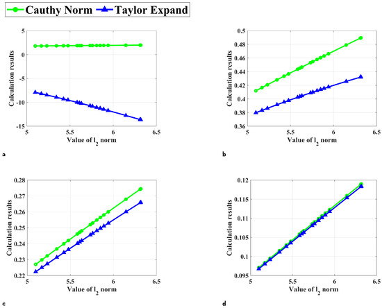 Curves of Taylor functions and Cauchy parametrization with different scaling parameters. The value of the x axis is , where X is a random matrix of size and denotes i-th column of X. The four figures correspond to four different parameter values as: (a) . (b) . (c) . (d) .