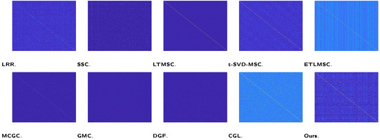 - DGF [44] (https://github.com/youweiliang/ConsistentGraphLearning, 15 January 2023): DGF learns the consistency and inconsistency among multiple views in a unified optimization model. For DGF, two parameters are selected from [, ] and [, ], respectively.