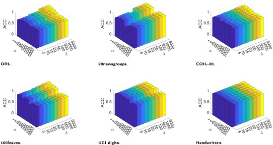 Performance in terms of ACC for and with a fixed and on six datasets.