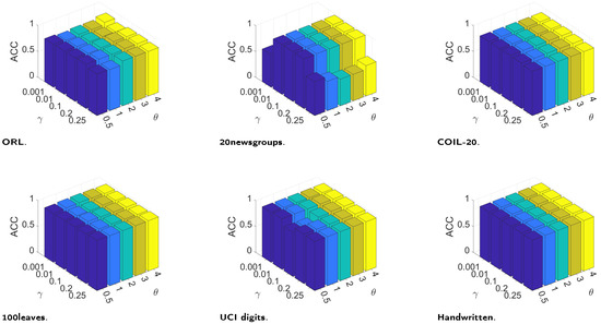 - LT-MSC [29]: LT-MSC explores the high-order correlation of the multi-view using a low-rank constraint. For LT-MSC, the parameter is selected from [, , ⋯, , ].