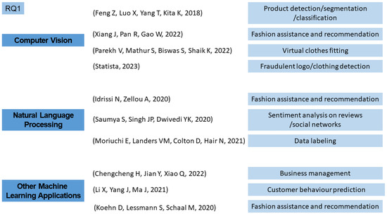 RQ1 is centered on the general AI trend in the fashion e-commerce sector. Figure 3’s summary of the literature review illustrates numerous subtopics employing various AI methods.