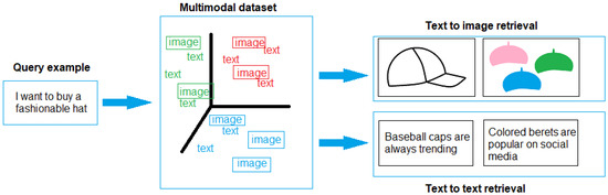 Combining various approaches is a very active topic of AI research. Since many of the works included in this review use a combination of CV and NLP techniques to achieve the goal, it was simple to see this effect [34,55,94,95,102,107,116,126,156,157]. When information from many modalities is included in a research problem, such as text–image, video–audio, or another combination, it is referred to as multimodal research. Compared to multimodal systems, a crossmodal system is a model that only receives data from a separate modality, such as when requesting an image response via text. A model produced by a multimodal system may have the same modality as the input or a different modality. In other words, multimodal systems can integrate several modalities together, such as text and visual. In particular, a crossmodal system, shown in Figure 4, is the process of using one modality to gain information in another modality.