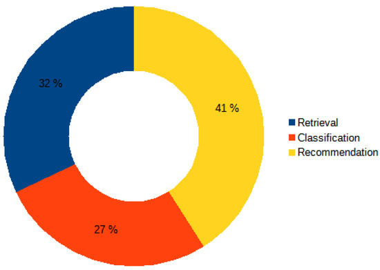 The information extraction process used to answer research questions RQ1, RQ2, and RQ3 is detailed in this section. Based on Ref. [24], this study divides artificial intelligence (AI) into three major categories: computer vision (CV), natural language processing (NLP), and other machine learning (ML) applications. The reasoning behind this division is that, when dealing with garment data, most authors process the images of the garments, their text description, or other data, with the first two being the more prevalent ones. This process has been carried out by taking into account recent research on AI in fashion e-commerce. Figure 3 shows the classification of the number of manuscripts by topic and subtopic in accordance with the study objectives. In the same figure, the number of articles linked to each topic is displayed in brackets.