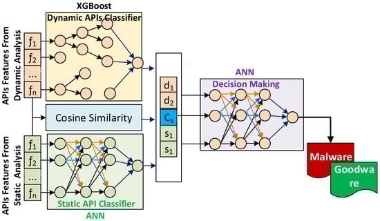 As can be seen from Figure 2 and Algorithm 1, the APIs-based feature vector of the dynamic behavioral analysis is inputted to the trained XGBoost prediction model, while the selected features that are extracted from static analysis to characterize the samples are inputted to the neural network prediction model. The output of these two models is two values that represent the scores of how likely the malware sample is similar to the learned malware patterns and how likely it is similar to the known benign patterns, respectively. These two features have been used along with the cosine similarity-based features as input to the second ANN classifier as a decision-maker. The output of the decision-making classifier is the class of the sample, either malware or benign.