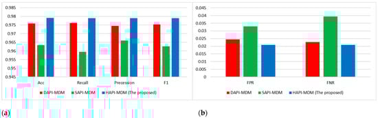 The dynamic analysis-based MDM, DAPI-MDM, performs better than the static-based MDM, SAPI-MDM. Due to malware authors’ use of obfuscation techniques, the APIs extracted from the dynamic analysis are misleading and do not represent the samples well. Accordingly, there is no clear discrimination between malware and non-malware. Meanwhile, in dynamic analysis, the accuracy performance is better than that of static analysis due to the difficulty in hiding the malware behavior. Thus, the mismatch between dynamically extracted APIs and statistically extracted APIs indicates obfuscation and further improves the proposed similarity-based hybrid MDM (HAPI-MDM) accuracy. As shown in Figure 4, HAPI-MDM also achieved the lowest false-positive and false- negative rate compared with the other models due to the good representation of the similarity-based feature used to boost the performance of the dynamic-based analysis.