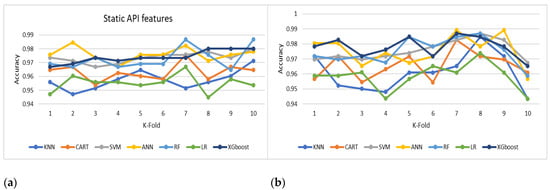 Detailed comparison of different machine learning techniques in terms of (a) static APIs and (b) dynamic APIs.