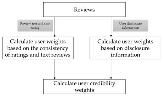 of their review texts. Thus, this section proposes approaches to compute the consistency weights of the two factors. The higher the weight, the higher the degree of consistency and the more credible the review. The computation process is as follows: