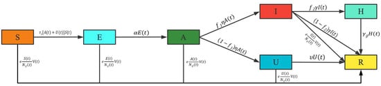 Assuming that a symptomatic infection can only be converted through A, the average duration of the asymptomatic infectious period is , and the report rate of symptomatic infectious individuals is , so at time t, the increment content of I and U equal and , respectively.