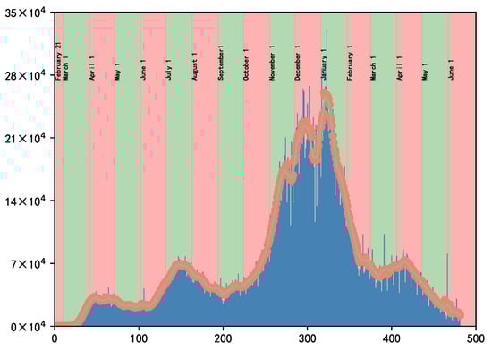 Diagram of daily reported cases, 7-day moving average of daily reported cases, and the continuum cubic spline interpolation of 7-day moving average of daily reported cases from 21 February 2020 to 15 June 2021.