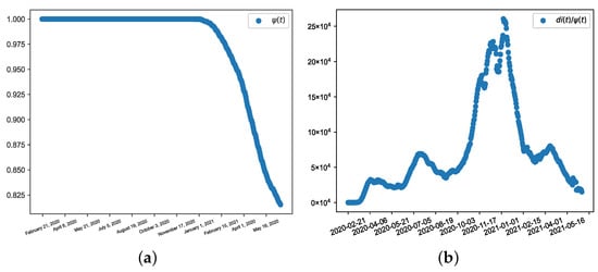 This study used Formulas (15)–(17) to simulate epidemiological time-series datasets in the United States. Furthermore, daily reported cases data, daily vaccination data, and demographic data were obtained from the Center for Systems Science and Engineering at Johns Hopkins University [], the Centers for Disease Control and Prevention [], and the US Census Bureau [], respectively.