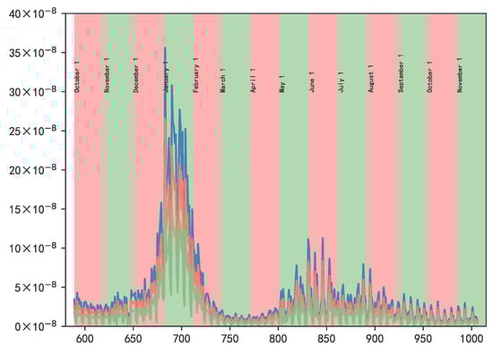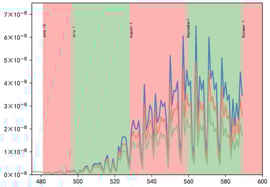 By using parameters values as shown in Table 2 and Formula (15), the time-varying transmission rate from to can be determined, which was graphed and is shown in Figure 4. It can be seen that , 99,332,530, 243,350, and 16,946, 40,670 from the model output, whereupon we calculated the time-varying transmission rates from to and after in terms of , and Formulas (16) and (17), as presented in Figure 5 and Figure 6. The blue, red, and green lines correspond to the transmission rate of , , and . In what follows, vaccine efficacy was set to 0, 0.63, and 1; the peaks of time-varying transmission rates at each stage and the time of occurrence are presented in Table 3, Table 4 and Table 5, respectively. Meanwhile, means that the vaccine is completely ineffective, and means that the vaccine is completely effective.