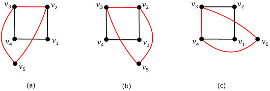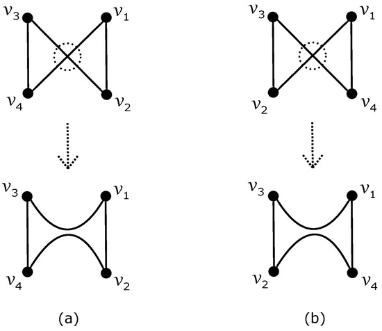 - Let be the empty set; that is, there is a subgraph . There are only two ways of obtaining the subdrawing of depending on which of the two edges or of is crossed by or , respectively. For both such possibilities, Lemma 2 also confirms a contradiction with (8) because it is not difficult to verify that is fulfilled for any , in all possible regions of .