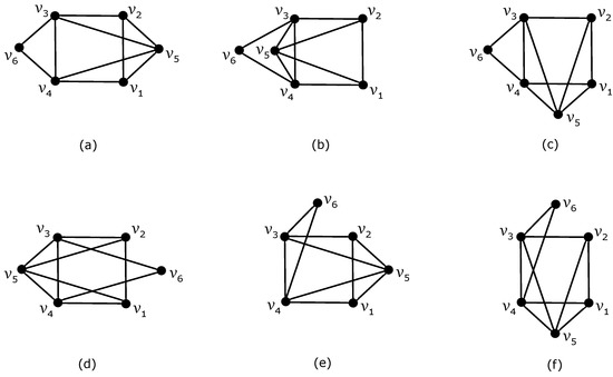 Six considered nonplanar drawings of graph with a possibility of obtaining a subgraph by which edges of can be crossed at most once: (a) the drawing of with and two crossings on edge ; (b) the drawing of with and two crossings on edge ; (c) the drawing of with and two crossings on edge ; (d) the drawing of with two crossings on both edges and ; (e) the drawing of with and two crossings on edge ; (f) the drawing of with and two crossings on edge .