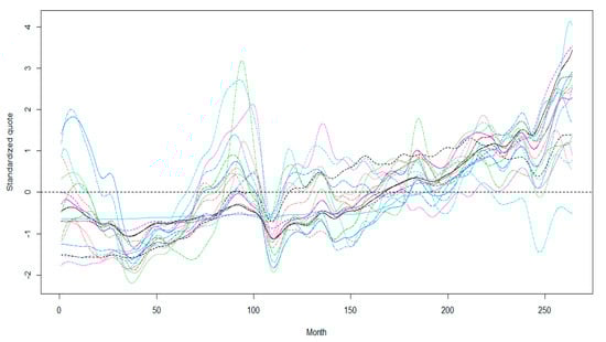 As can be observed in Figure 1, it seems that there is a generalized pattern of behavior among the indices. The black solid line represents the average function considering all stock indices. It is important to note that, among the functions, there are periods in which variability is appreciated, such as the period marked by observations 50 and 100. However, it seems to identify a pattern of generalized behavior among the indices from observation 100 (referring to the year 2008), in which clearly the variability between functions decreases, providing evidence of similar behavior among them. A similar behavior tends to strengthen in observation 50, which coincides with the period of the “Dot.com” financial crisis. This seems to indicate that the pattern of generalized behavior tends to strengthen in crisis periods, as can be seen in the two periods of economic turbulence mentioned above.