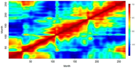 To reinforce the analysis, Figure 2 presents the correlation surface. It is possible to appreciate that the highest correlation occurs between 50 and 250 months (years 2004 and 2020, respectively) with a positive value greater than 0.5. This would suggest that the effects observed during observation 50 (2004) could be similar to COVID-19 crisis effects.