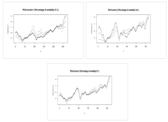 As a second step, identify the countries that are related considering a metric given by principal component scores based on multivariate correlation. According to Chávez-Chong et al. [43], FPCA is an extension of the classic Principal Component Analysis, in which principal components are represented by functions and not by vectors. FPCA finds the set of orthogonal principal component functions that maximize variance across each component. The functional principal component represents the variance of the scores of the principal components, it is maximized subject such that: