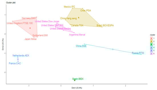Notice first, in Figure 4, that Group 1 consists of the UK’s FTSE 100 stock index, Germany’s DAX, Switzerland’s SMI, and Japan’s Nikkei. The second group is made up of the three main stock indices of the United States, S&P 500, Dow Jones, Nasdaq, and Merval of Argentina (consistent with correlation analysis, with one of the highest values). In the same way, for this group, the observations are closer to each other. The third group is made up of three Latin American economies: Mexico, Chile, and Brazil (IPC, IPSA, and IBOVESPA, respectively), in addition to China’s Hang-Seng and Canada’s TSX. The fourth group is made up of the Netherlands with the AEX stock index and the French CAC index. Moreover, Shanghai, with the SSE stock index, and Russia, with the RSTI, make up the fifth group. Finally, the country that is separated from the others is the IBEX of Spain.