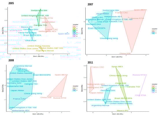 Stock index clusters by K-means. (2005, 2007, 2008, 2011). Author’s own elaboration with data from Yahoo Finance and R-4.3.1 software.